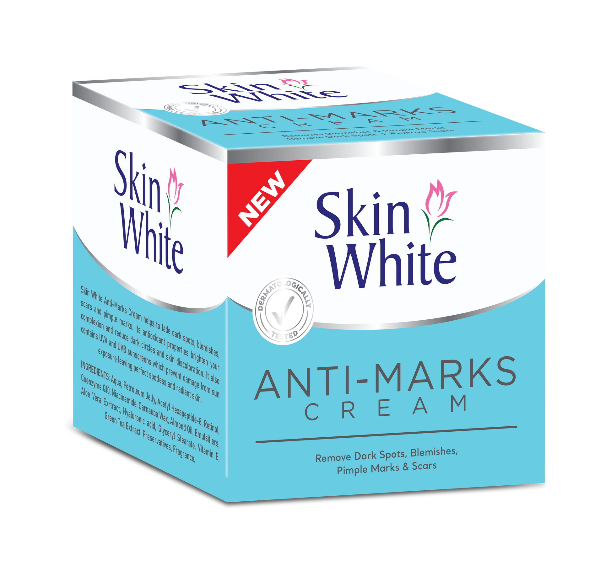 Skin White Anti-Marks Cream helps to fade dark spots, blemishes, scars, and pimple marks. Its antioxidant properties brighten your complexion and reduce dark circles and skin discoloration. It also contains UVA and UVB sunscreens which prevent damage from sun exposure leaving perfect spotless and radiant skin.